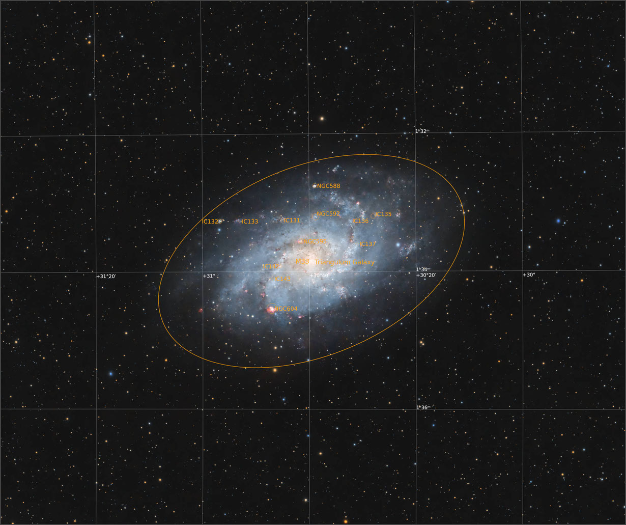 M33 ist nach der Andromedagalaxie und der Milchstraße die drittgrößte Galaxie der lokalen Gruppe. Nach neueren Berechnungen beträgt die Entfernung von uns zu M33 ca. 2,7 bis 2,9 Mio. Lichtjahre. Ihr wahrer Durchmesser beträgt ca. 50.000 Lichtjahre. Entdeckt wurde die Dreiecksgalaxie vermutlich um das Jahr 1654 von Giovanni Batista Hodierna.